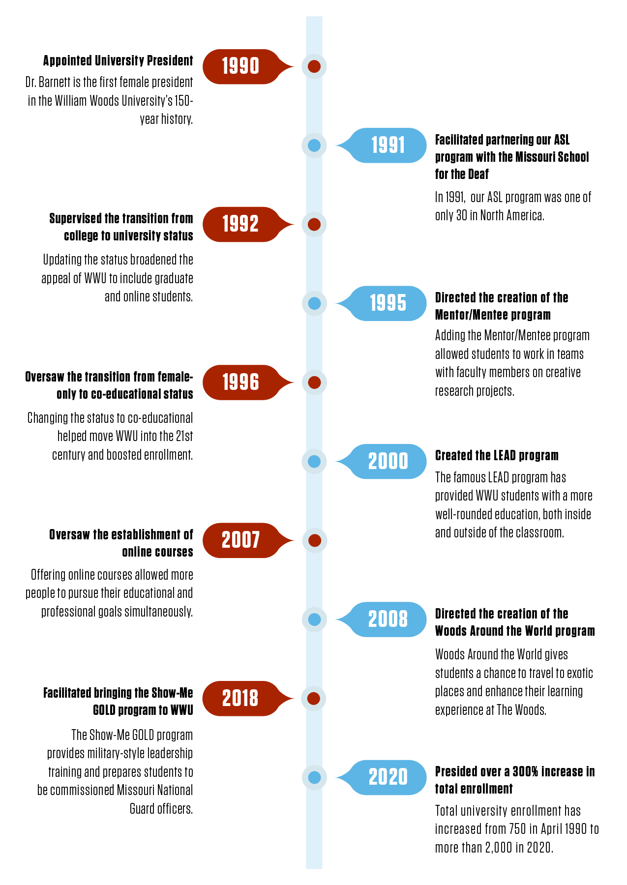 2020 marked the 30th anniversary of Dr. Barnett’s appointment as WWU President on April 21, 1990, a three-decade period in which she has guided the University through a generation of extraordinary change. Under her leadership, William Woods made the transitions to university (1993) and coeducational (1996) status; added graduate-level, online and study abroad programs; added a variety of out-of-class experiences to augment a student’s well-rounded education, including the Woods Around the World study-abroad program, and the Mentor/Mentee, Service Learning and LEAD co-curricular programs.