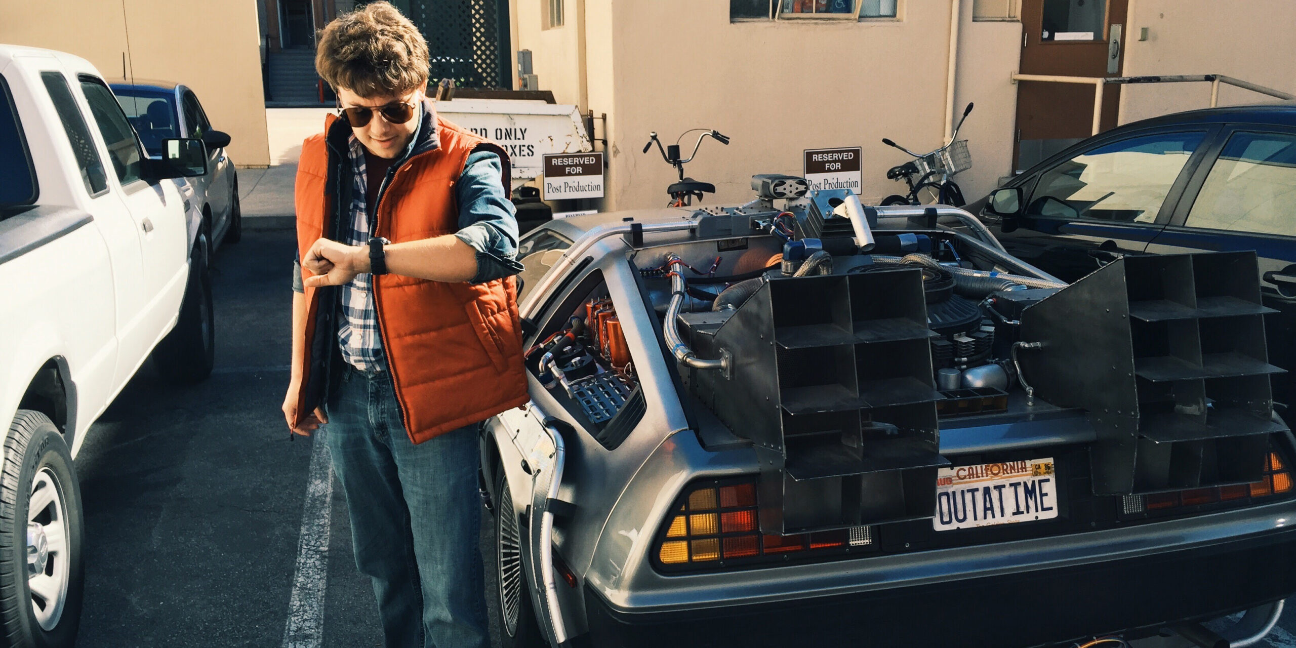 Joshua Potter posing as Marty McFly with the DeLorean from Back to the Future.